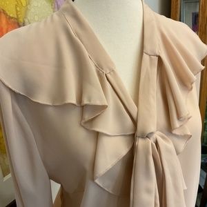 What an amazingly delicate, blush coloured, neutral tone, all-season blouse. It will fit into your wardrobe seamlessly. You can tie a bow or leave it untied. I’ve worn it both ways. It’s a straight cut and meant to be a bit loose.