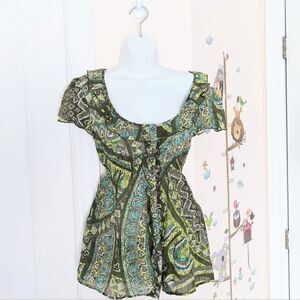 Ruffle cotton silk top abstract print green Large please see photo with measurements