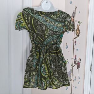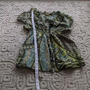 Ruffle cotton silk top abstract print green Large please see photo with measurements