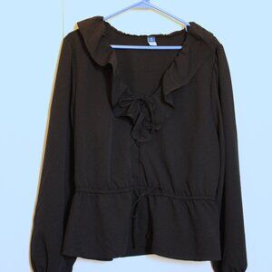 Never worn. Old Navy Black Jack 2 blouse with swashbuckling look: bell sleeves, ruffled neckline, drawstring waist and ruffled bottom hem. 100% polyester.