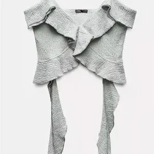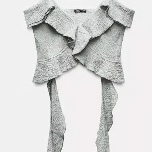 Unworn, new without tag. Stylish ruffles, pale green/grey colour..