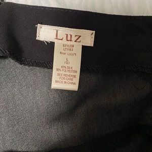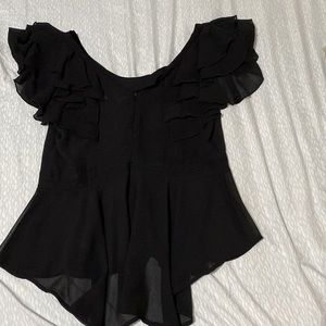 65% Silk Black Ruffled Blouse that is unworn but got years ago. No Tag. Perfect top to dress up or dress down. Elegant Looking ruffles on its sleeves makes a bit of a semi sleeveless.