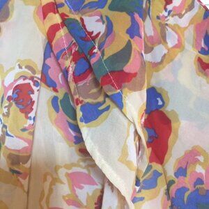 Ruffled short sleeve blouse. Slightly transparent fabric. Brand : Babi. : Polyester chiffon. Color : Multi floral print. Size: S.