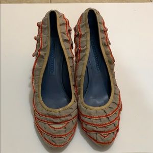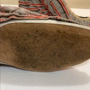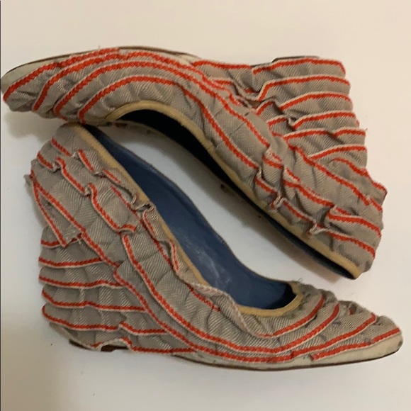 Wedge heels with tan ruffles and orange details. Well worn but still has life. Was holding on to them as inventory for future projects. It’s time to pass them on!!