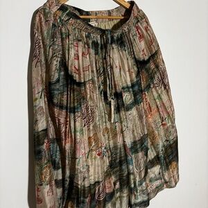 Hurts to sale this one! Beautiful hand painted design called "Park" - raw silk, layered with 100% cotton lining. Pockets. Really flowy. Elastic waist. It fits true to size,. Lots of pleats. New, never worn! I just don't wear it. This is a beautiful brand: