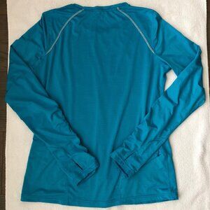 Running Room Fit Wear Activewear Long Sleeve Crew Neck Striped Top in Turquoise + Grey w thumb holes - no fabric tag