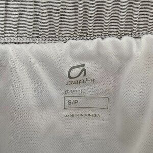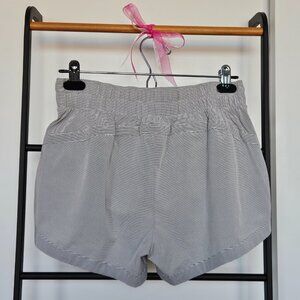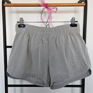 -White/gray striped running shorts, brief liner, small built-in pocket