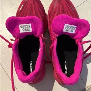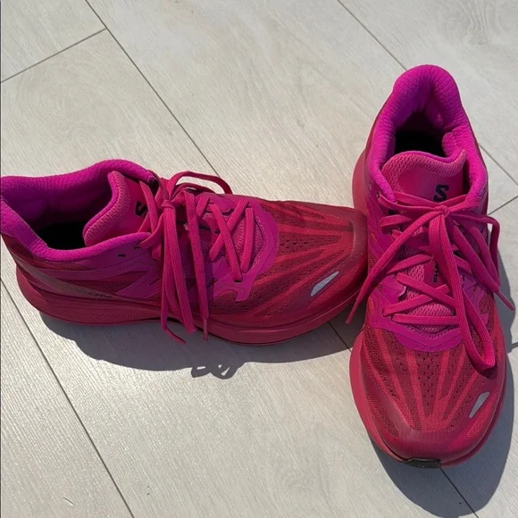 Dynamic pink shoes by Salomon. Perfect for running and active lifestyle. Sleek design with comfort.