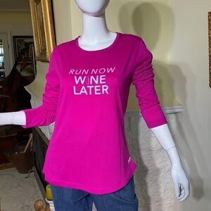 In excellent preowned condition fun running t-shirt from The Running Room features a rounded collar, long sleeves, lightly fitted, and that print…😜. A great technical running top that will wick sweat and keep you comfortable and cool while running or running errands.