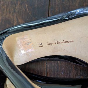 Black patent leather Rupert Sanderson platform peep-toe pumps with emboss details at counters and covered heels.