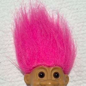 Russ Troll. Purchased in early-mid 90’s. Still in good condition with some noticeable wear throughout as expected from age & being a play toy several years ago- Hair has a rougher feel & appearance as pictured in photos, particularly over the right eye where some of the glue holding the hair has pulled up slightly (last photo) and at the back (2nd photo) Approximately 4 inches tall (not including hair) Russ marking on bottom of foot. Perfect for imaginative play and collecting.