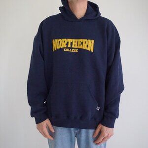 Show off your school spirit with this vintage '90s Russell Athletic hoodie, featuring bold yellow “Northern College” collegiate lettering across a deep navy cotton base. Made from soft, heavyweight cotton, this classic pullover delivers the perfect blend of comfort, warmth, and retro campus style.