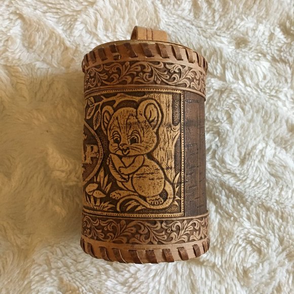 Excellent vintage condition, handmade, Russian Tuyesok, wood relief/burned birch-bark sugar cannister, featuring a kitsch mouse and floral motif. 'Caxap' means sugar. I don't know if I would personally store sugar inside of this container, but it would be great for storing hard and soft candies in wrappers. Beautifully made.