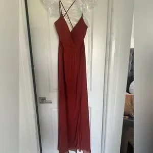 This rust dress is great as a bridesmaid dress or even another formal event. Very trendy for August and Fall. Size 8 and bought off the rack.