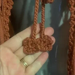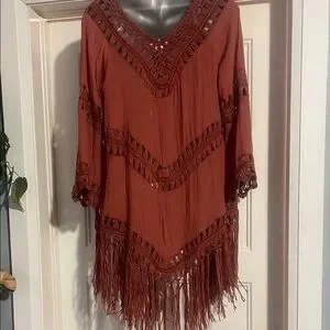 Add a bohemian touch to your wardrobe with this rust fringe cardigan. Ideal for layering and enhancing your style.