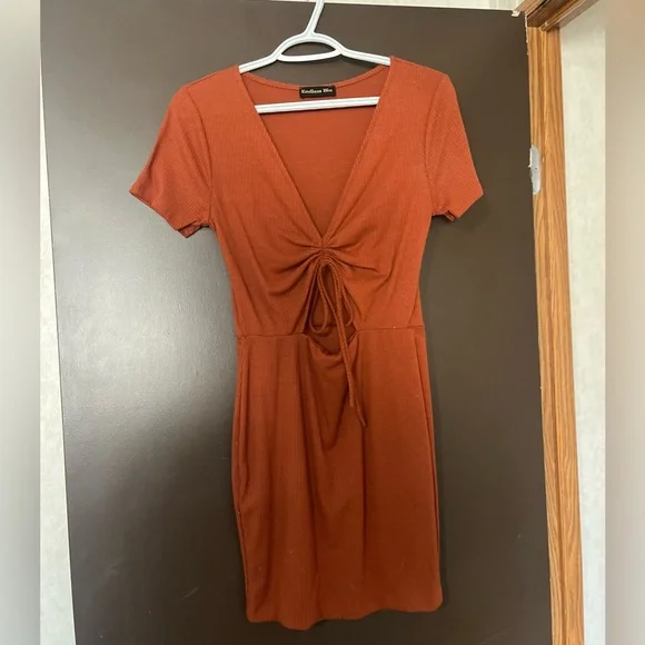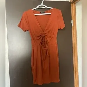 Chic terracotta mini dress with a stylish front tie. Short sleeves and a flattering silhouette.