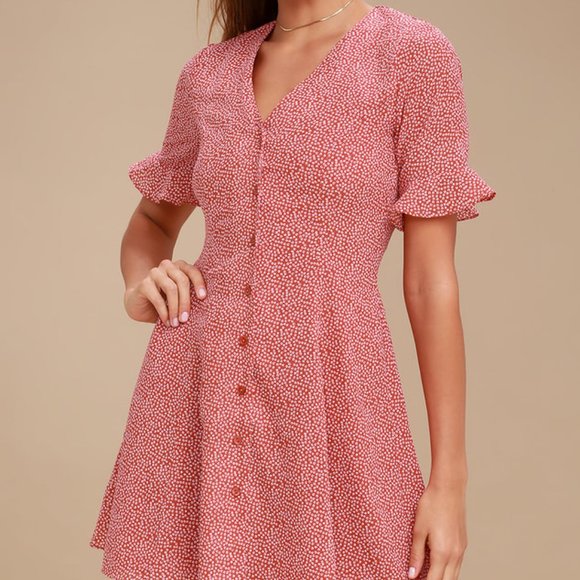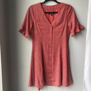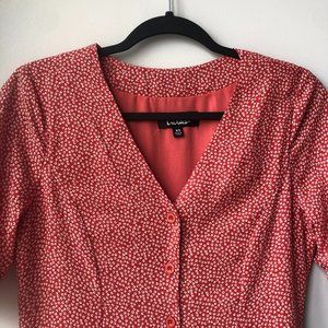 A V-neckline and short, flounce sleeves are made from lightweight woven poly in a ditsy rust and ivory print. Princess-seamed bodice with full button placket and tying waist sash. Fit and flare skirt.
