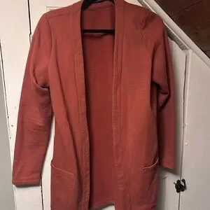 This warm, rust terracotta cardigan features a long, open-front design perfect for layering. Made from a soft, medium to heavy weight knit, it offers both comfort and style. The cardigan's fine, uniform texture adds a touch of elegance to any outfit.