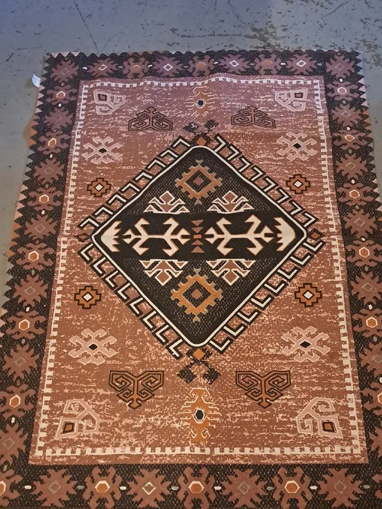 Add warm, rustic style with this rust-colored tribal area rug. The design features bold geometric patterns and contrasting black and cream accents. Durable weave brings texture and a cozy feel to living spaces. Easy to style with earthy or neutral décor.
