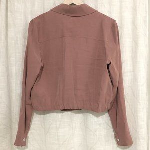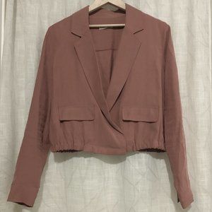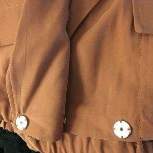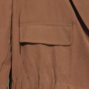Very good preowned condition, rust wash-coloured, cropped, bomber blazer by Dex. The colour is a sort of rusty, orange, pink. Very pretty. The blazer can be done up with a strong and secure button closure. The ruched waist gives it a flattering fit. Hardly ever worn.