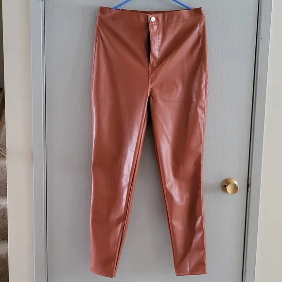 Enhance your wardrobe with these stylish rust wet look pants, perfect for making a bold fashion statement. The sleek, glossy finish offers a modern and edgy vibe, ideal for both casual and dressy occasions. With a flattering slim fit and classic button closure, these pants provide a comfortable yet chic silhouette. Pair them with your favorite top for a trendy and polished ensemble.