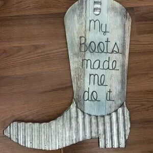 Charming rustic boot wall decor with 'my boots made me do it' text. Perfect for adding a country touch to any room.