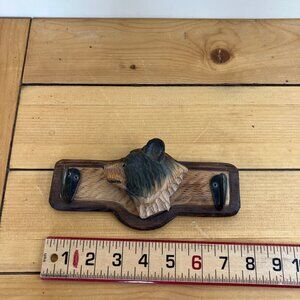 Carved wooden wall mounted hanger has 2 metal hooks on each side of the wooden bear head. Has metal hardware on the back for hanging. Good pre-owned condition, small marks to surface from normal use The pictures show the actual item that you will receive. Approx. 7 1/2" wide x 3 1/2" high x 1 3/4" deep including hooks.