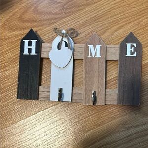 Enhance your space with this charming rustic wall decor featuring the word 'HOME'. Crafted with a blend of black, white, and brown tones, it adds a cozy touch to any room. Perfect for hanging keys or small items.
