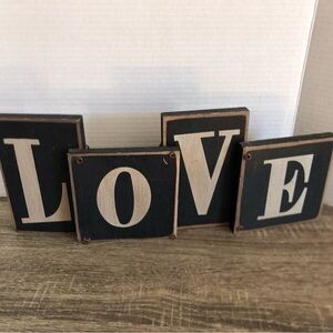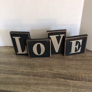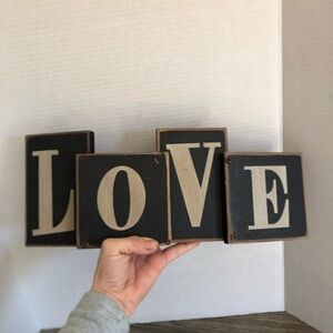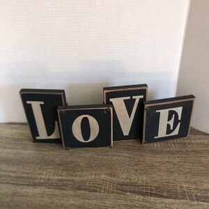 Wood painted with the word love. Each letter on its own piece of wood. Metal wire holds the pieces together.