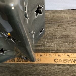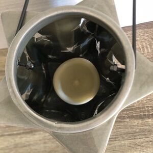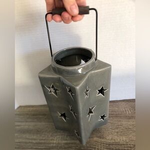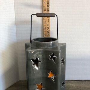 Illuminate your space with this lovely grey star ceramic lantern. It contains a pillar battery operated candle.