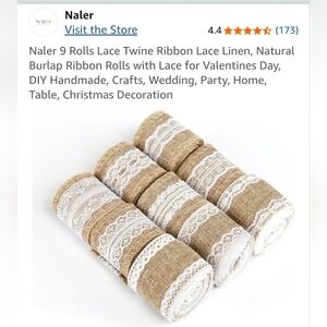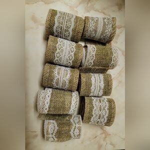 -Nine rolls of burlap ribbon. White lace trim. Perfect for crafts or decorating.