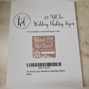 -Rustic wedding hashtag signs. The sign has a burlap and lace design. There is a blank space for writing the hashtag. Includes 24 signs.