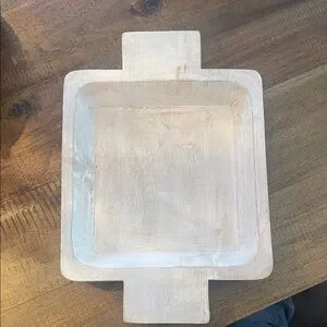 Enhance your home with this rustic wooden tray. Its natural wood finish adds a touch of elegance to your space. Perfect for holding essentials. White wash dough-bowl. Size 14.25 by 10 height 2.75. Mango wood.