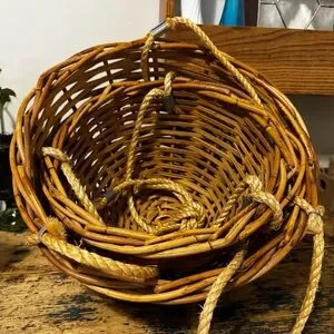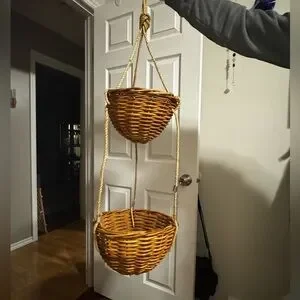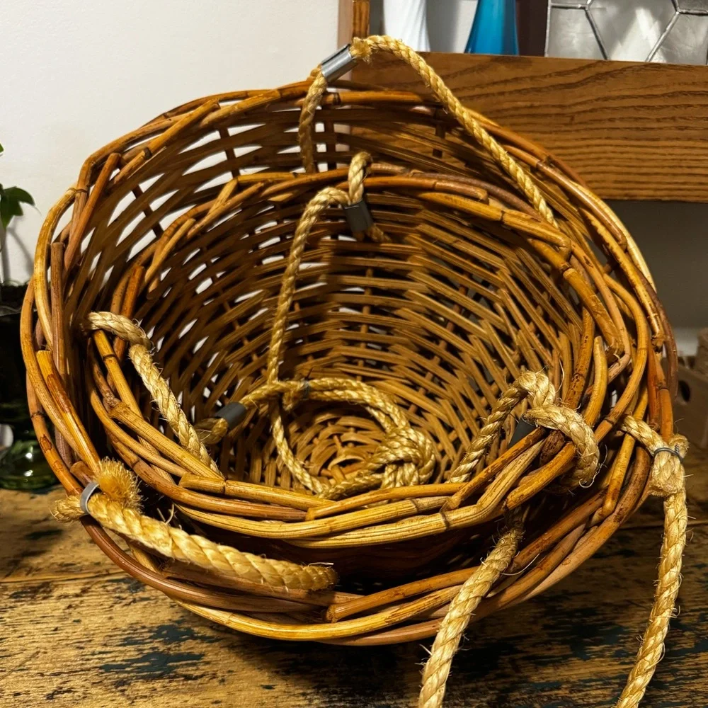 Enhance your home with this rustic woven hanging baskets. Featuring a natural brown color, it's perfect for adding a touch of warmth to any room. The sturdy rope handles make it easy to hang and display. Baskets are 9” tall x 13” round and 7.5” tall x 10.5” round. Estimated length for hanging is 2’-3’