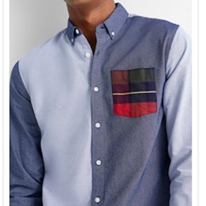 Tartan plaid and denim organic cotton Oxford shirt new with tags. Modern straight fit, button down, one pocket on chest, 100% organic cotton, rounded high-low hem. Marked size M. All measurements are approximate and taken with the garment laying flat: Armpit to armpit 22" Shoulder to shoulder 18'' Sleeve from armpit 20''.Total length 29.5". This item comes from a smoke free, pets friendly home. Recycled bags/box used when possible. Please, let me know if you'd like any additional info. Thanks for watching!