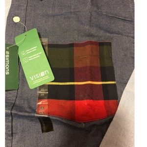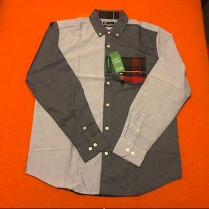 Rustic denim and plaid tartan black and red organic cotton Oxford shirt NWT
