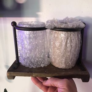 Made from metal , wood and glass ! Glass vases are removable. These not only make great propagation stations they also make for great rustic, country and retro style decor