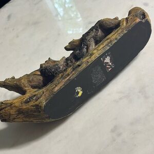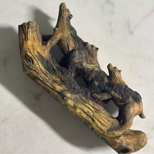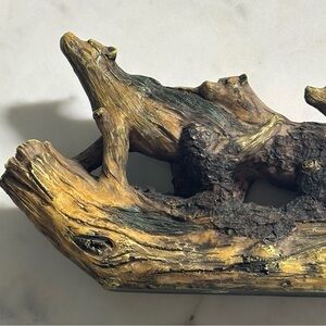 Rustic sculpted resin bears in the woods decorative decor. This delightful piece looks like it was carved from real wood (it is NOT actual wood though.) It would be excellent addition to your rustic cabin decor, or a great gift for any outdoor and animal enthusiast. In very good preowned condition with one small chip (pictured).