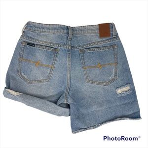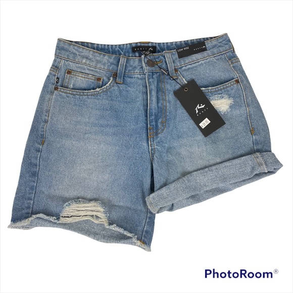 New With Tags Rusty Low Rise Jean Shorts. Distressed, Medium Blue Wash.