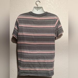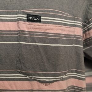 Rvca T-Shirt, Women's, NWOT, Sz. Lg. Casual Fit', baby pink, grey, & white horizontal stripe pattern with a right side pocket with crocheted logo.