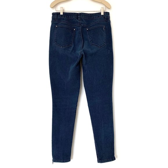 Extremely comfortable skinny stretch jeans, mid-rise, closing with a zipper and button. Cute pleated accent on knees. Zipper detail at bottom of legs. Great condition.