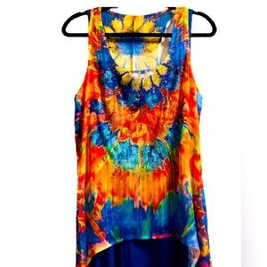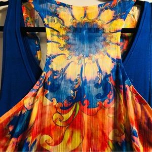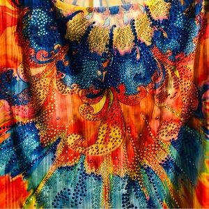 I have taken all the guesswork out of what to wear with this Brilliant S Twelve topper. It has metallic threads creating sparkle as well as beads in royal blue turquoise, orange, and yellow, embellishing the front. Semi sheer scoop neck, racer back, high front long back. Wear separately with jeans or even shorts.