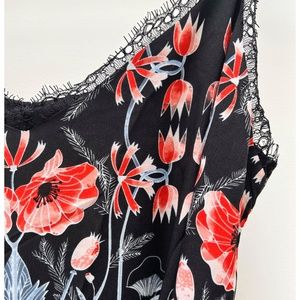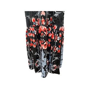 FLORAL FLOWY WITH WAIST TIE. BLACK WITH FLORAL PRINT, LACE TRIP ON THE TOP/CHEST AREA