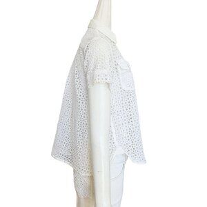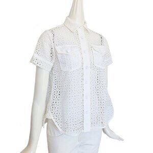 Crafted from white eyelet lace, this shirt features grosgrain trim, two front pocket and front button closure.