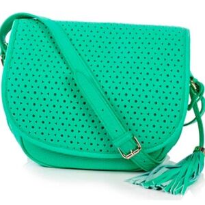 SADDLE BAG, ISAAC MIZRAHI SOFT LEATHER, SHAMROCK GREEN, SHOULDER STRAP, FULL LINING, POCKETS, PERFORATED EXTERIOR ACCENT, MAGNETIC CLOSURE, TASSLE, SLEEPER BAG, NEW NEVER USED, NO DAMAGE