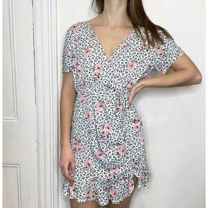 The Ellie Mini is an animal and floral printed mini dress with ruffles and side ruching.
