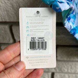 Reversible for 2 different looks, floral on one side, solid teal colour on other. Low rise bottom with moderate coverage and small sideways, perfect for tanning. Fabric has sun factor UV +50. Brand new with tags. Sanitary sticker attached.