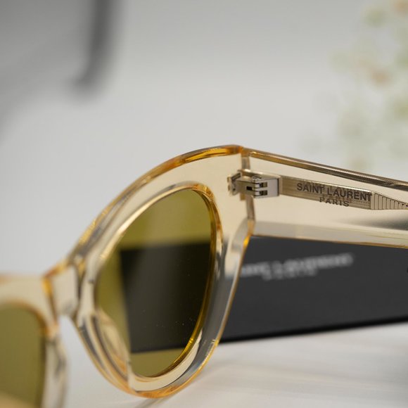 Expertly crafted in Italy from premium acetate, these transparent yellow sunglasses from Saint Laurent will be a timeless addition to your accessory collection. They show off a bold rounded, cat-eye profile with khaki green tinted lenses and are complete with metal hardware at the temples.