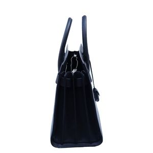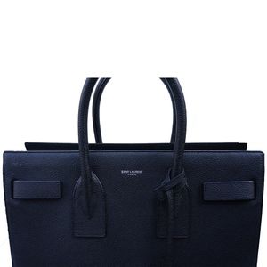 Saint Laurent Small Sac du Jour in black grained leather, silver-tone hardware, rolled top handles, black canvas lining, three interior compartments; one with zipper closure and an open top. No original packaging and does not come with shoulder strap.