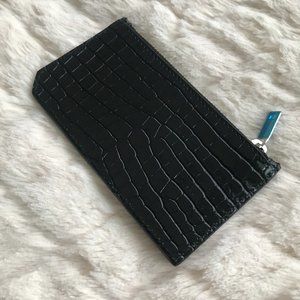 GUSSETED ZIP CASE WITH SMALL METAL YSL INITIALS AND CARD SLOTS ON THE FRONT.